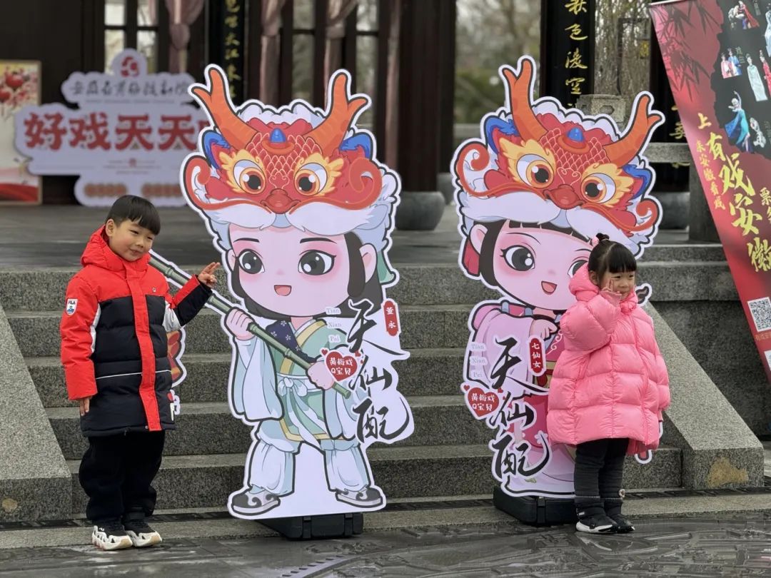 安慶園內(nèi),與精彩演出一起到來(lái)的,還有省黃梅戲劇院原創(chuàng)黃梅戲IP形象——黃梅Q寶貝,Q寶貝們可愛(ài)的臉龐收獲了一大批觀眾朋友的喜愛(ài),其中不乏活潑可愛(ài)的小朋友們,他們興奮的與Q寶貝合影:“這是七仙女和董永,他們我都認(rèn)識(shí)!”