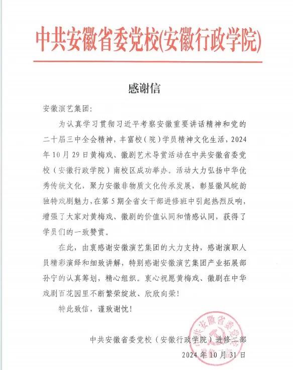 近日,安徽省委黨校(安徽行政學(xué)院)給集團(tuán)發(fā)來(lái)感謝信,由衷感謝集團(tuán)于10月29日在省委黨校南區(qū)舉辦的一場(chǎng)黃梅戲、徽劇藝術(shù)導(dǎo)賞活動(dòng)。信中指出,活動(dòng)大力弘揚(yáng)了中華優(yōu)秀傳統(tǒng)文化,聚力安徽非物質(zhì)文化傳承發(fā)展,彰顯了徽風(fēng)皖韻獨(dú)特戲劇魅力,在第5期全省女干部進(jìn)修班中引起熱烈反響,增強(qiáng)了大家對(duì)黃梅戲、徽劇的價(jià)值認(rèn)同和情感認(rèn)同,獲得學(xué)員們一致贊譽(yù)。