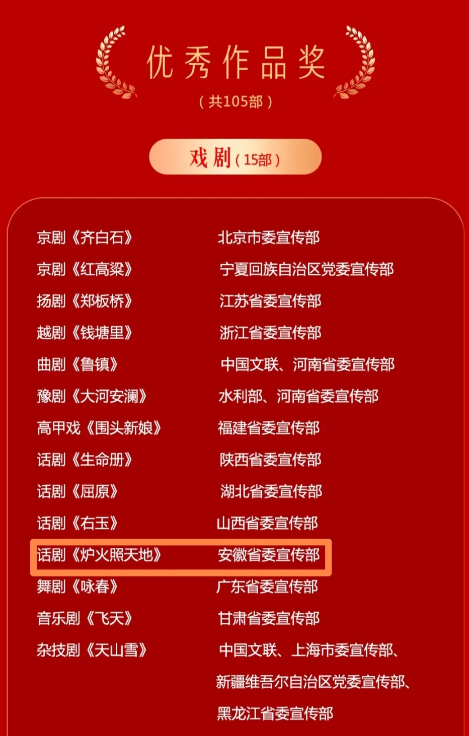 12月3日,中共中央宣傳部印發(fā)表彰決定,對(duì)第十七屆精神文明建設(shè)“五個(gè)一工程”組織工作先進(jìn)單位和優(yōu)秀作品進(jìn)行表彰。授予話劇《爐火照天地》等105部作品“優(yōu)秀作品獎(jiǎng)”,授予安徽等15個(gè)省區(qū)市黨委宣傳部“組織工作獎(jiǎng)”。