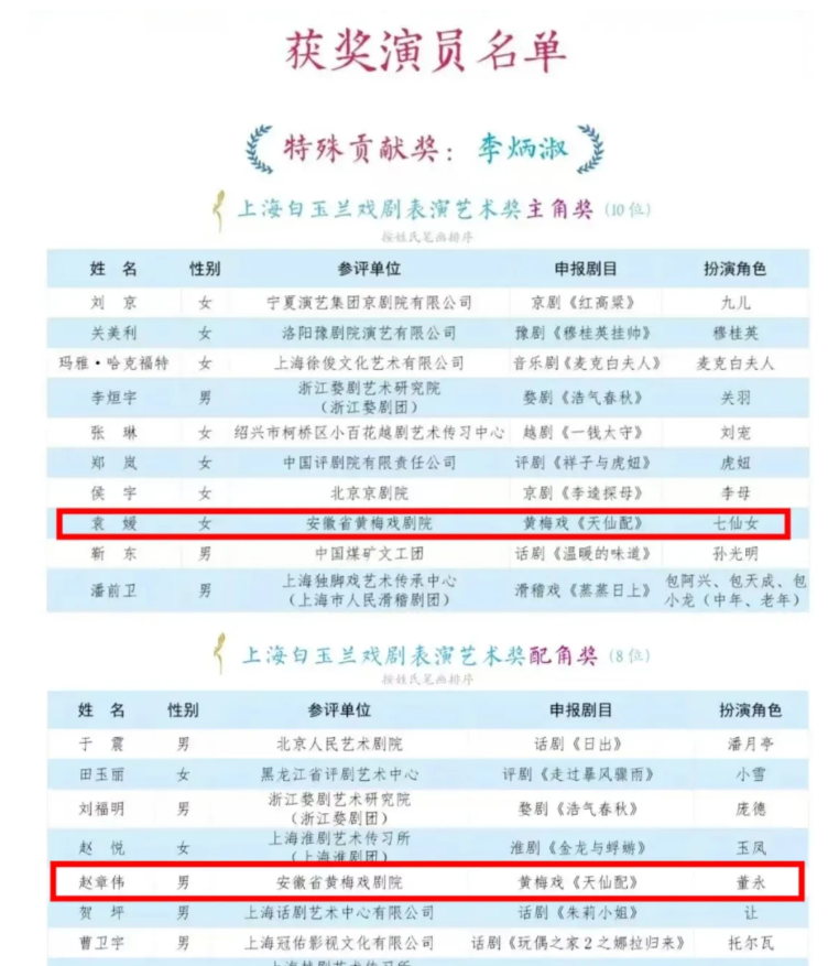 2月27日晚,第33屆上海白玉蘭戲劇表演藝術(shù)獎頒獎晚會在上海文化廣場舉行。安徽省黃梅戲劇院袁媛、趙章偉分別憑借黃梅戲經(jīng)典劇目《天仙配》榮膺白玉蘭戲劇獎主角獎和白玉蘭戲劇獎配角獎。